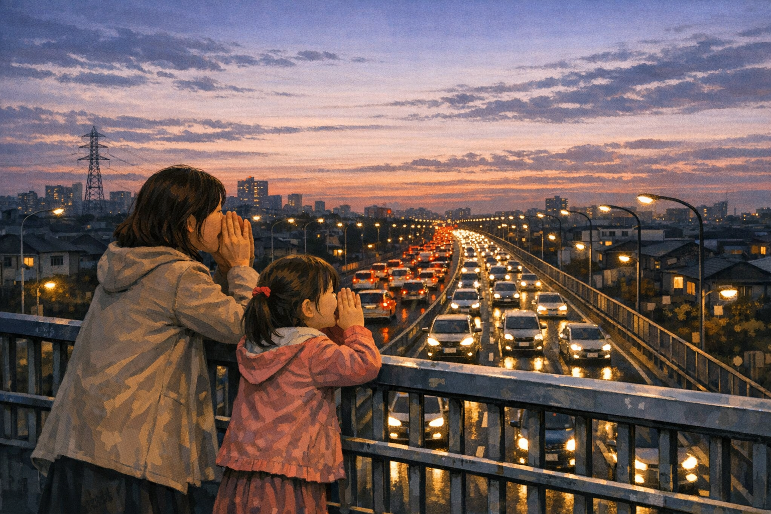 車は無関心に流れていた。沿道に水銀灯がともった。轟々と流れる車の川の上で、私と桃子は南の方を向いて立っていた。(終)