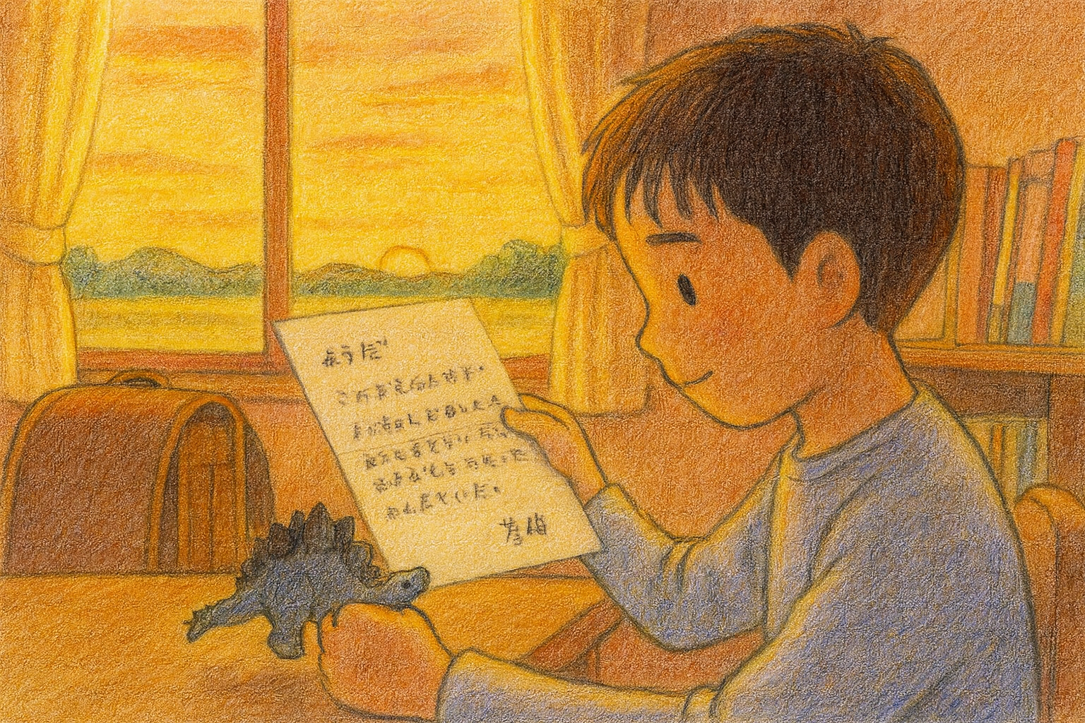 読み終えたトモキは、しずかに胸をなでおろした。そして、つくえの引き出しから、よっちゃんの分まで買っておいた小さなステゴザウルスのフィギュアを、ギュッとにぎりしめた。