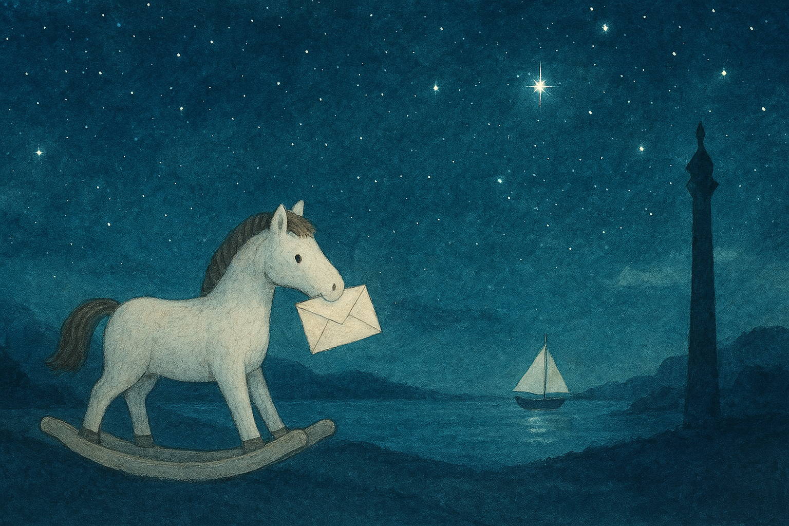 この描写も深く内密な時間が支配していて読者の心の染みいります。そんな夜だからこそ不思議な出来事も受け入れられるのです。木馬が手紙をくわえて郵便局へやってきたことも違和感がありません。