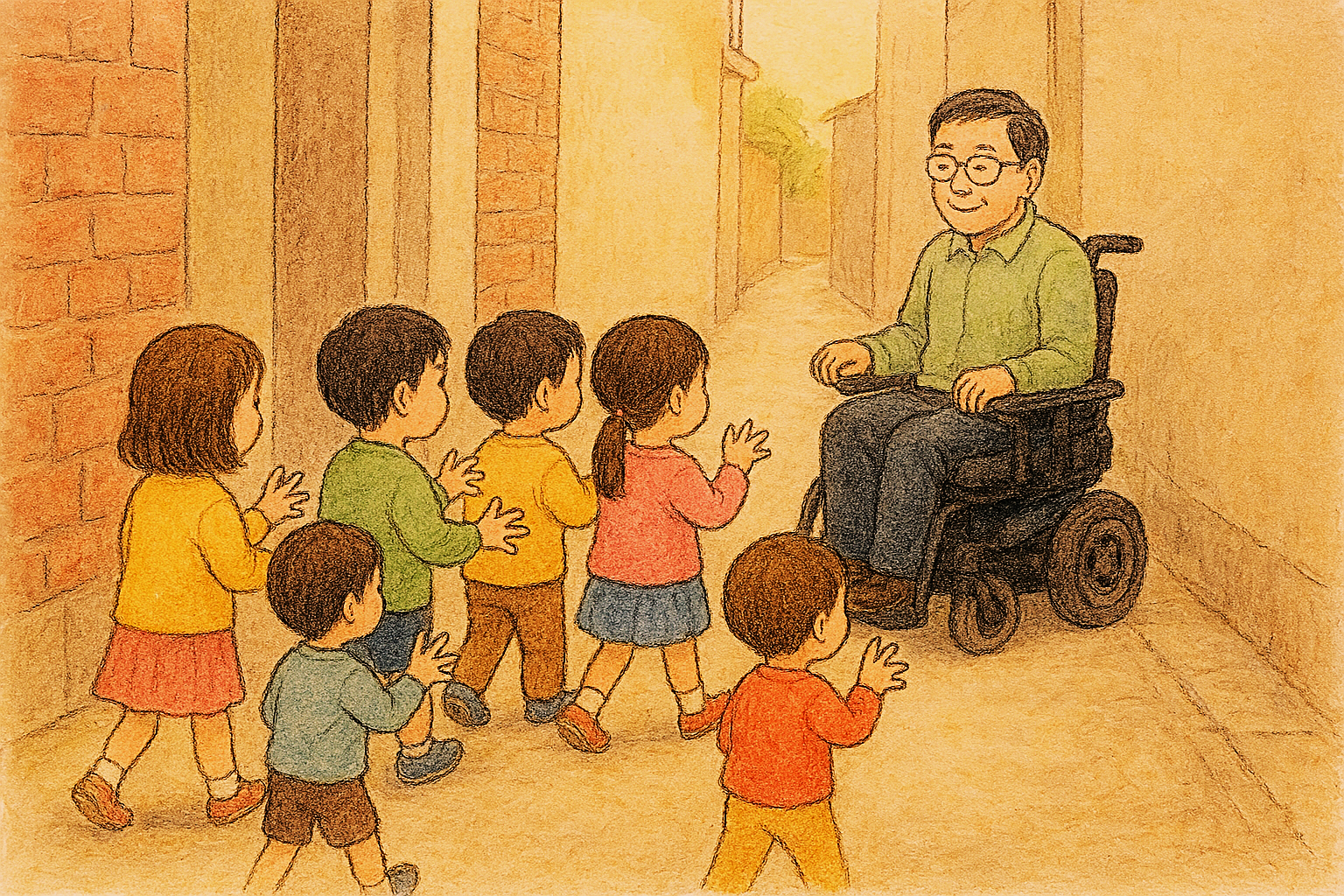 「みんな~、車イスの人が通るからここは、カニさん歩きだよ~。」